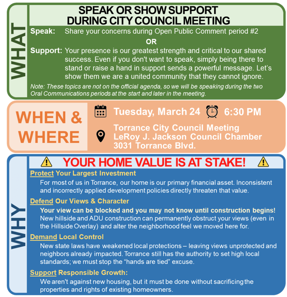 New state laws have weakened local protections—leaving views unprotected and neighbors already impacted. Torrance still has the authority to set local standards and is allowing more construction than state law mandates. We want updates to local laws and planning processes that actually prioritize neighborhood compatibility, protect property equity, and utilize the full extent of local control allowed by law to preserve the unique character of our neighborhoods.